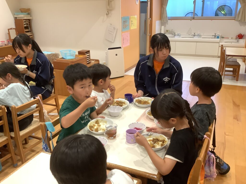 子ども達が自分で作ったカレーをいただきます。高校生は配膳のお手伝いをします。