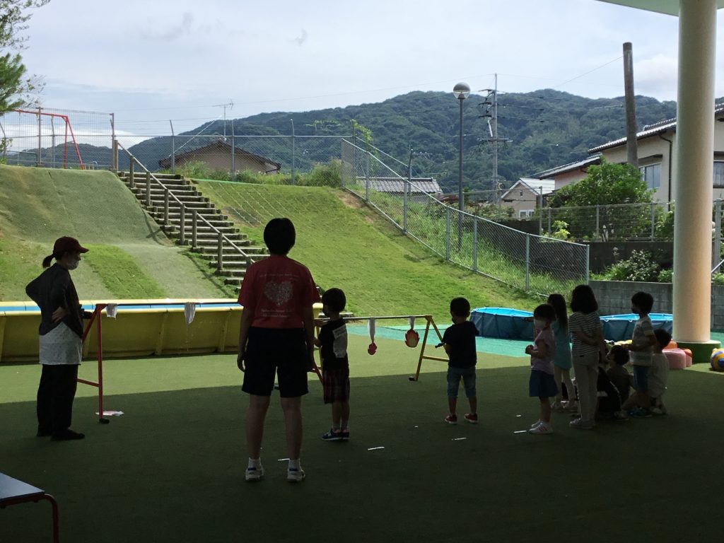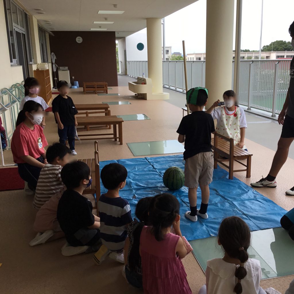 3年こども教育進学コース「附属園 年長児 夏季保育」実習② 【宝さがし】 なぞなぞを解いたり、ゲームをしたりして宝物をさがします。 【スイカ割り】 クラスの皆で力を合わせて一つのすいかを割ります。「右、右!もっと右!」スイカを割った後は皆でおいしくいただきました。 2021.07.14 前の記事へ 一覧 次の記事へ