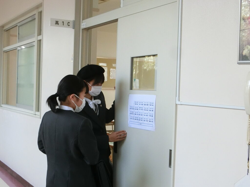 教室の前で先輩と一緒に自分の座席の位置を確認します。
