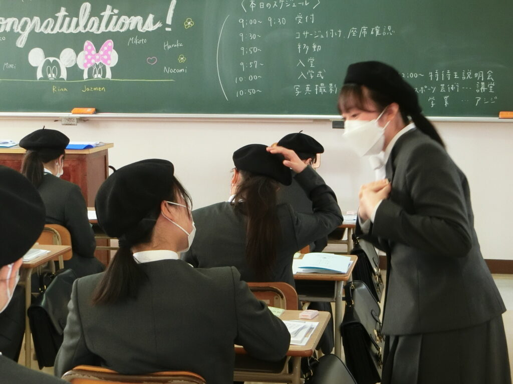 ベレー帽をかぶり、左胸に校章とコサージュをつけて、先輩から入学式についての説明を受けました。